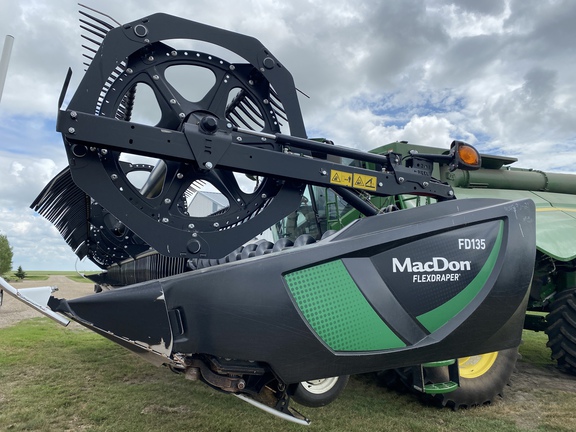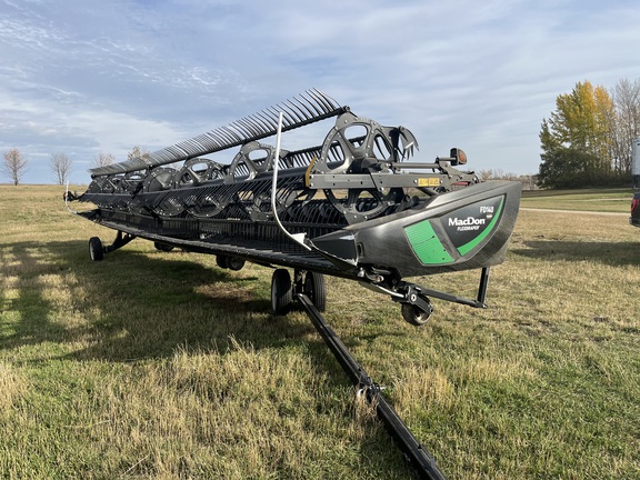 Low usage on this 35' Hinged Flex Draper. S-Series Ready, Integrated Transport, Fingered Top Cross Augers, High Wear Skid Shoes, Flex Cutterbar, Seal Kit, Coarse Tooth Knife with Spare Knife....