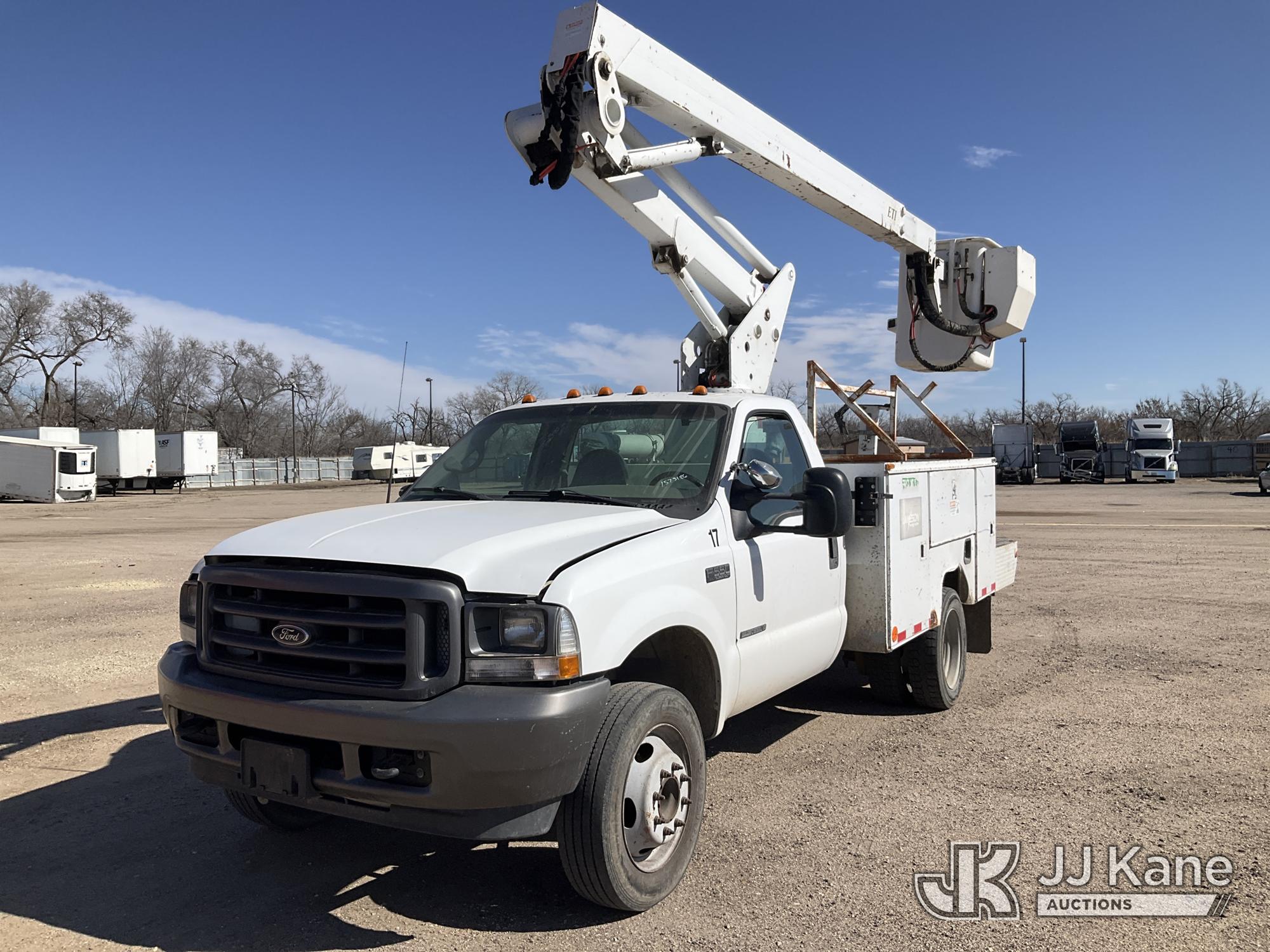 ETI ETC37-IH, 42 ft, Articulating & Telescopic Bucket s/n 0201C72292, with single man bucket, mounted behind cab on 2002 Ford F-550 Regular Cab 2WD DRW Service Truck, 7.3L V8 OHV 16V TURBO DIESEL RWD,...