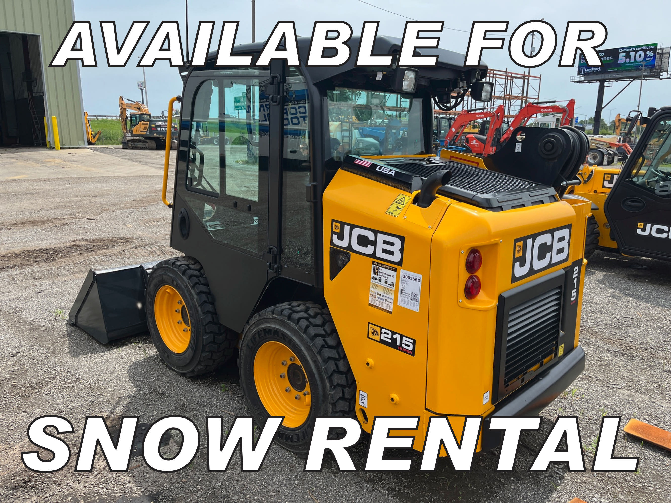 JCB 215 Skid Steer Loader. 10x16.5 10PR Lifemaster Tires. Cab/heat/AC. 7-Way JCB Controls. Standard Flow Hydraulics. Block Heater. 2 Speed w/creep. Vinyl Air Suspension Seat. Powered Quickhitch. 3.2 S...